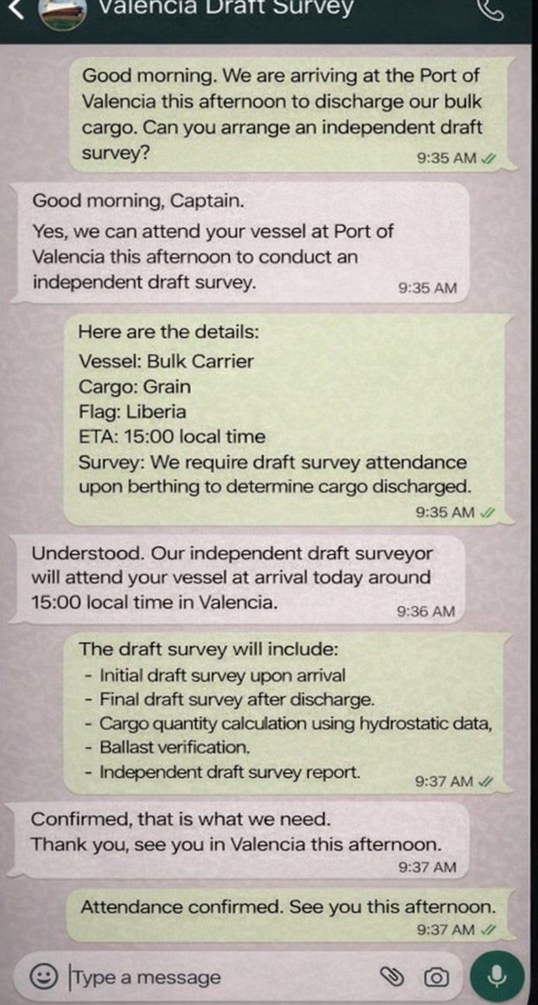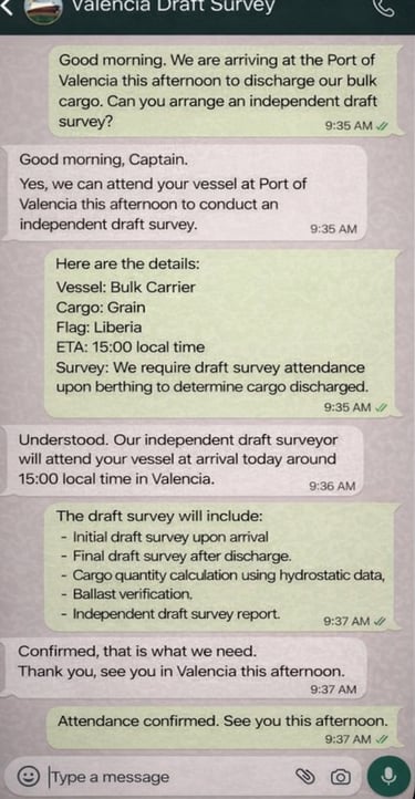 Contact an independent draft surveyor instantly via WhatsApp to arrange draft survey attendance for bulk cargo vessels calling Spanish ports.